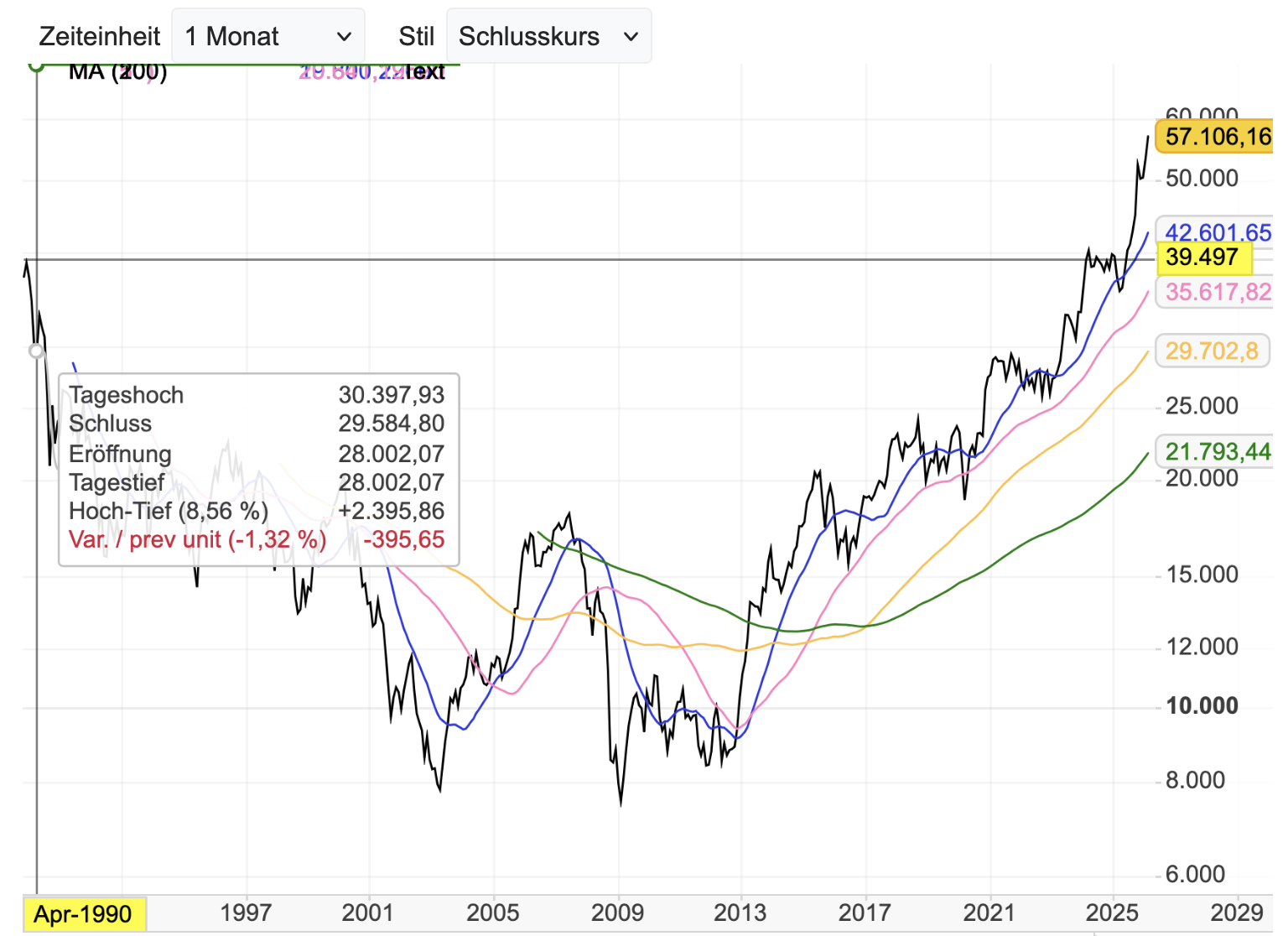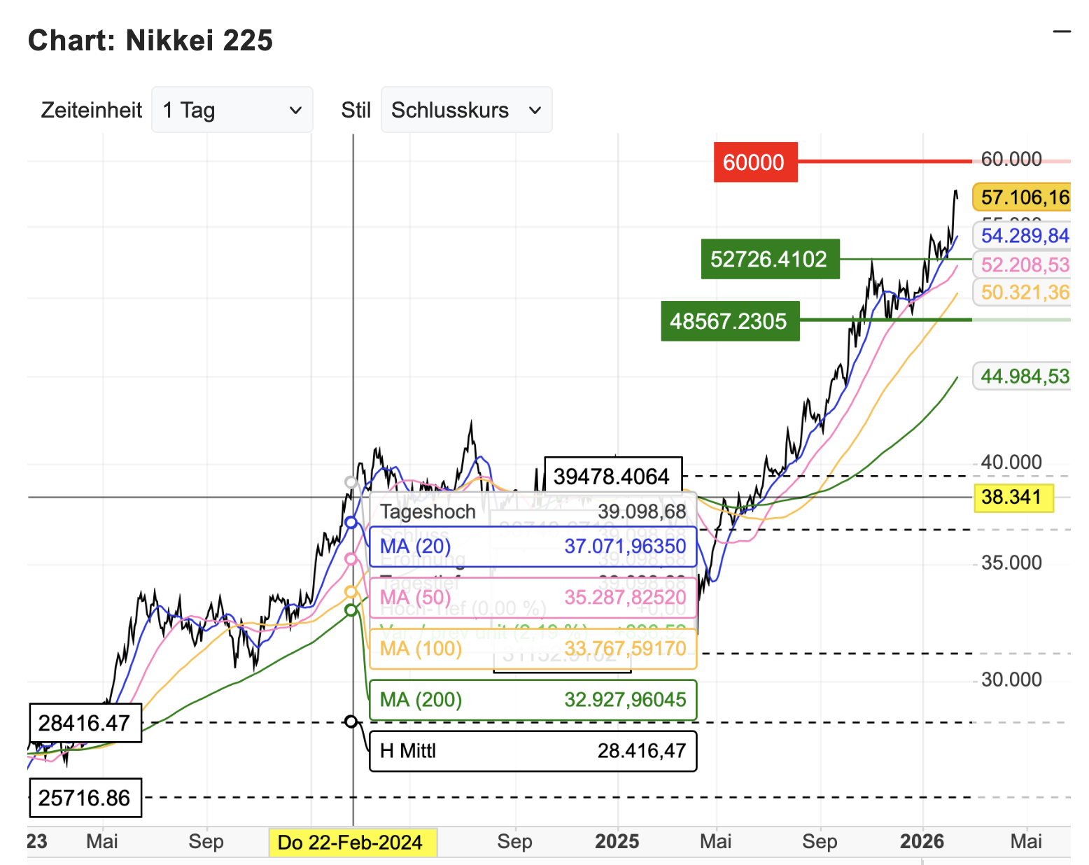 Aber aktuell jagt ein Rekord den nächsten (Letztstand 56.947 Pkt., 46% Anstieg in zwei Jahren), und dank des klaren Wahlsieges letzter Woche von Japans erster Ministerpräsidentin SanaeTakaichi, die sich in der Tradition von ShinzoAbe und seinen auf billigem Zentralbankgeld und flexibler Fiskalpolitik beruhenden Wirtschaftsreformen Abenomics) sieht, spricht wenig gegen weitere Kursgewinne. https://2cm.es/1jRQS