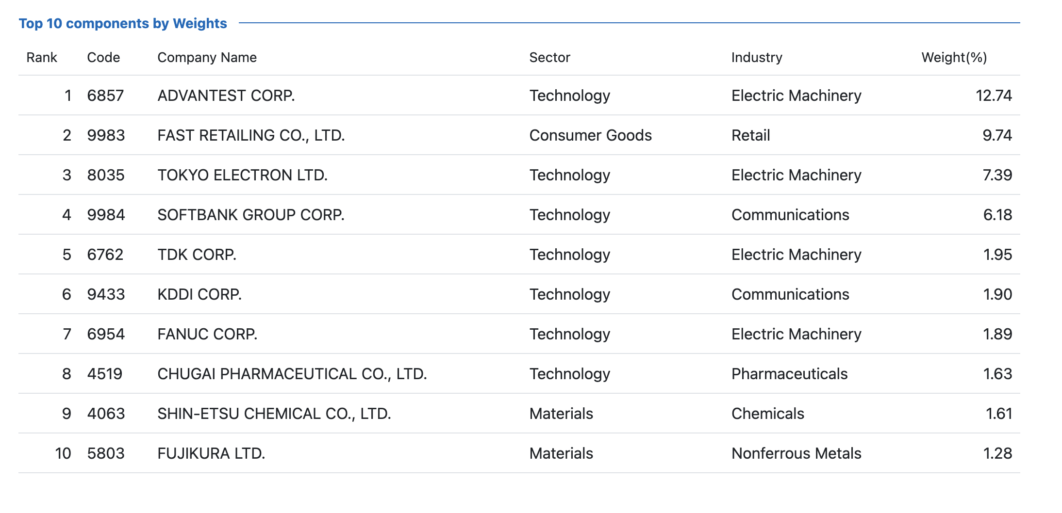Das führt dazu, dass von den 10 am höchsten gewichteten Aktien lediglich 3 Titel auch zu den am höchsten kapitalisierten Unternehmen des Landes zählen, nämlich Advantest, Softbank undTokyoElectron, wären z.B.Toyota als größtes Unternehmen mit einer aktuellen Marktkapitalisierung von $322 Mrd. nicht unter den Top 10 aufscheint. https://2cm.es/1oVDl