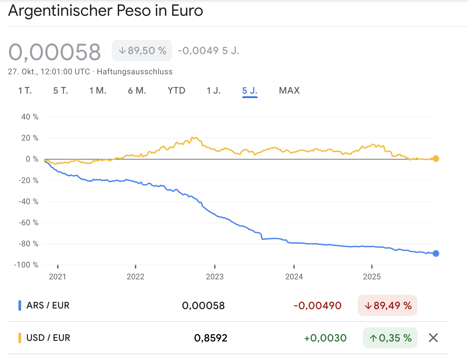 Vorallem aber schuf er Vertrauen, dass nicht nur geredet, sondern auch gehandelt wird, was Milei nun zu gute kam. Allein die Staatsverschuldung in Relation zum BIP hat sich in kürzester Zeit halbiert. Die Wirtschaft wächst wieder und dank der Währungskäufe der USA stabiliert sich der Peso wenn auch auf niedrigem Niveau wie oben zu sehen.