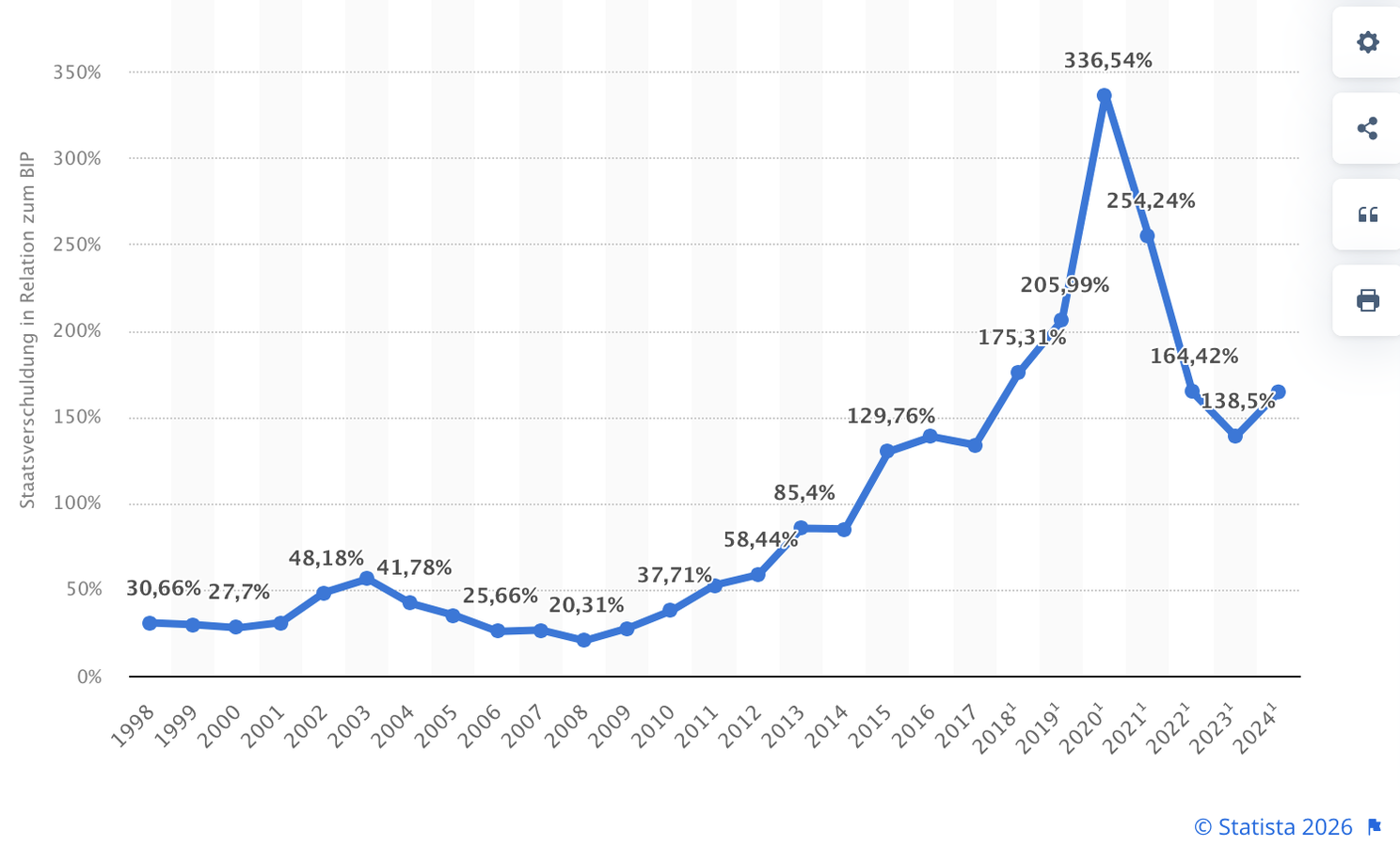 Laut statista.com beträgt der aktuelle Schuldenstand im Verhältnis zum BIP 2024 bereits 168% Tendenz steigend